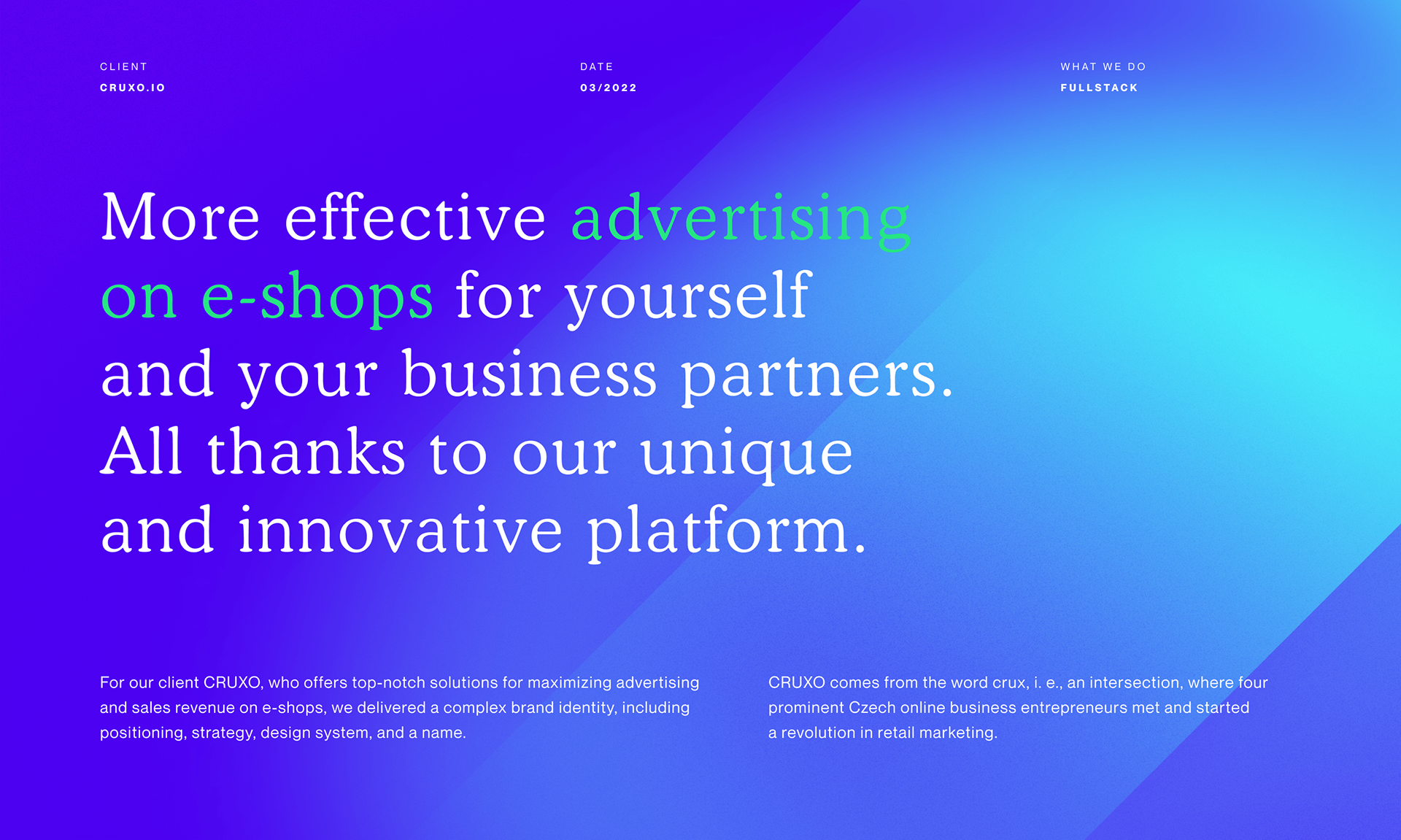 CRUXO comes from the word crux, i. e., an intersection, where four prominent Czech online business entrepreneurs met and started a revolution in vendor marketing.